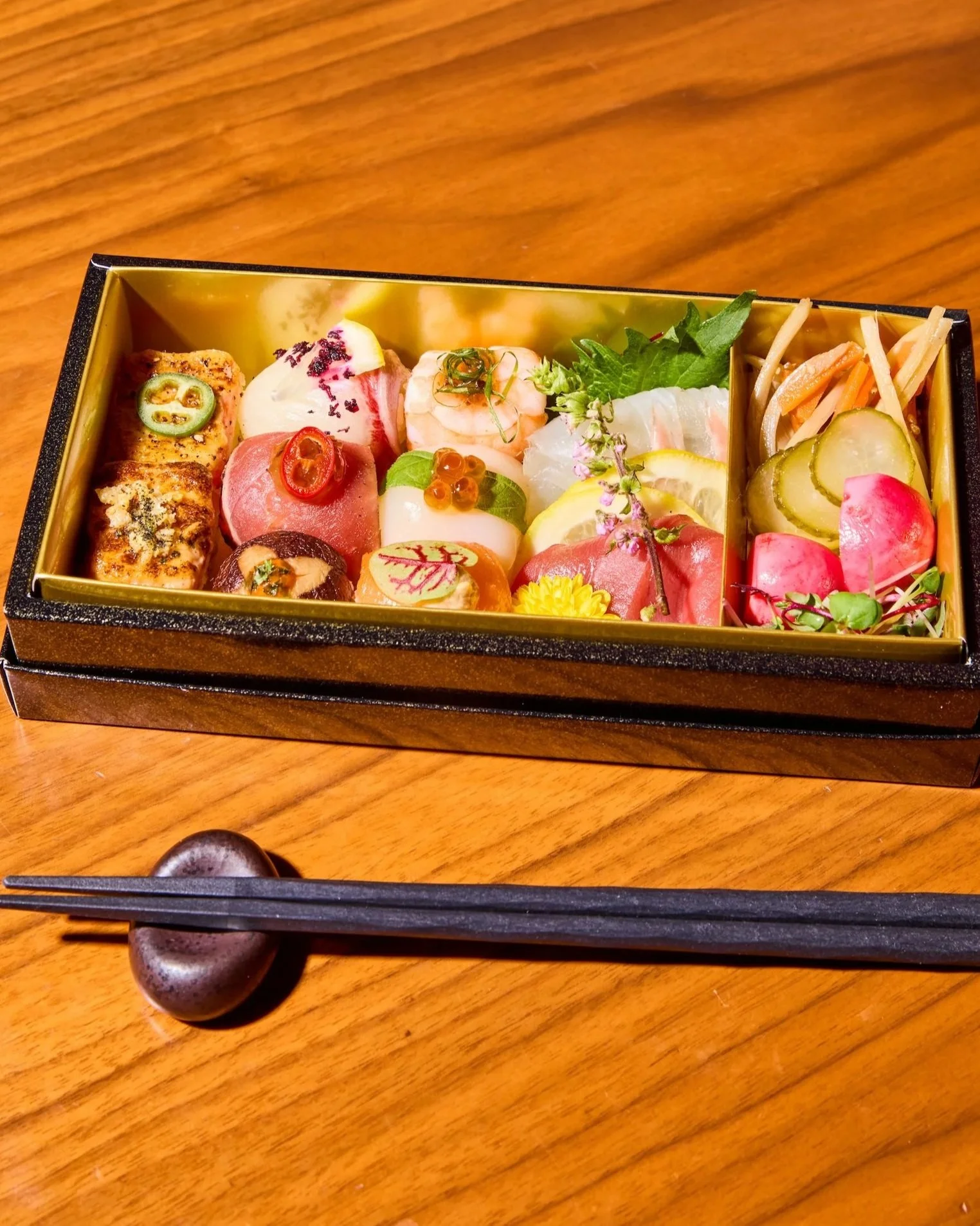 Each box is suitable for one person and features a collection of Temari Sushi Sphere of Salmon, Hamachi, Hotate (Hokkaido Scallop), Ebi, Yellowfin Tuna, Soy Shiitake, Assorted Sashimi, and Aburi Oshi Sushi.